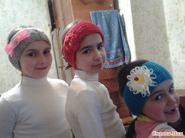 Позвонила сестра: "Гвалт, нужно срочно, выручай" . Дети едут в санаторий и нужны повязочки на голову. И это все нужно делать до утра. Что тут поделаешь... Собрала свои остаточки пряжи, и вот что вышло...