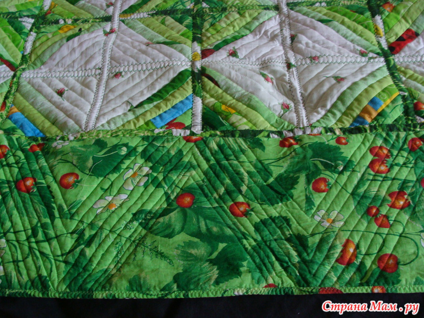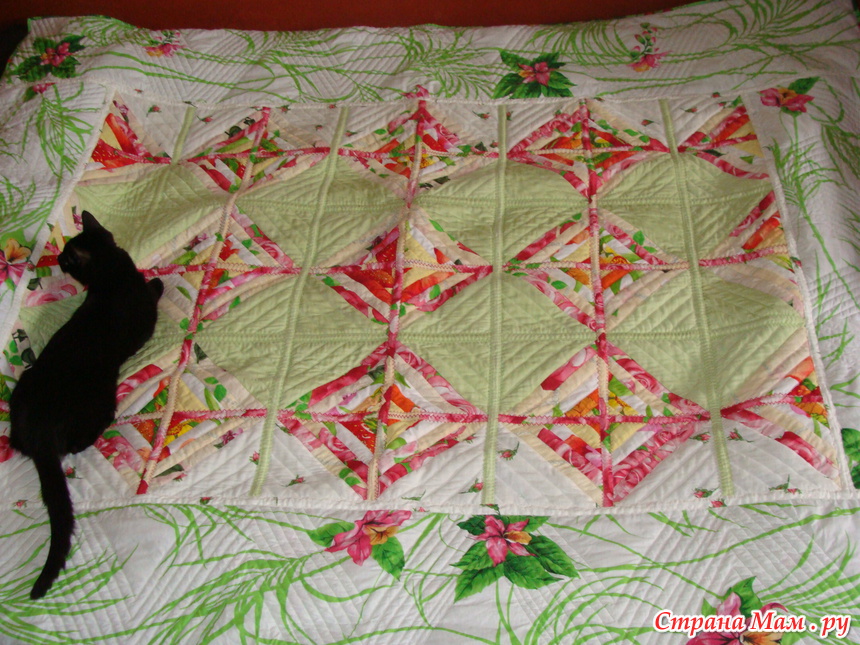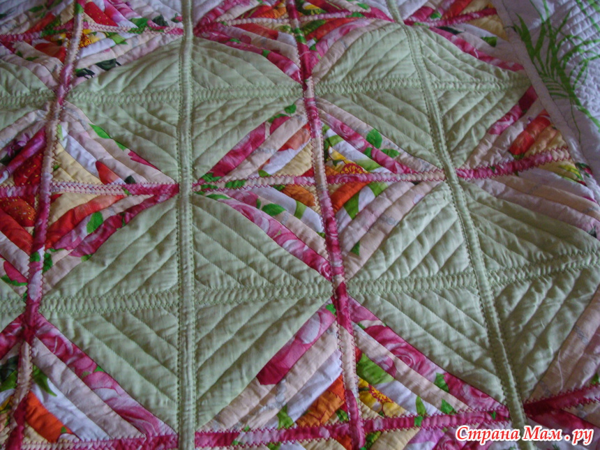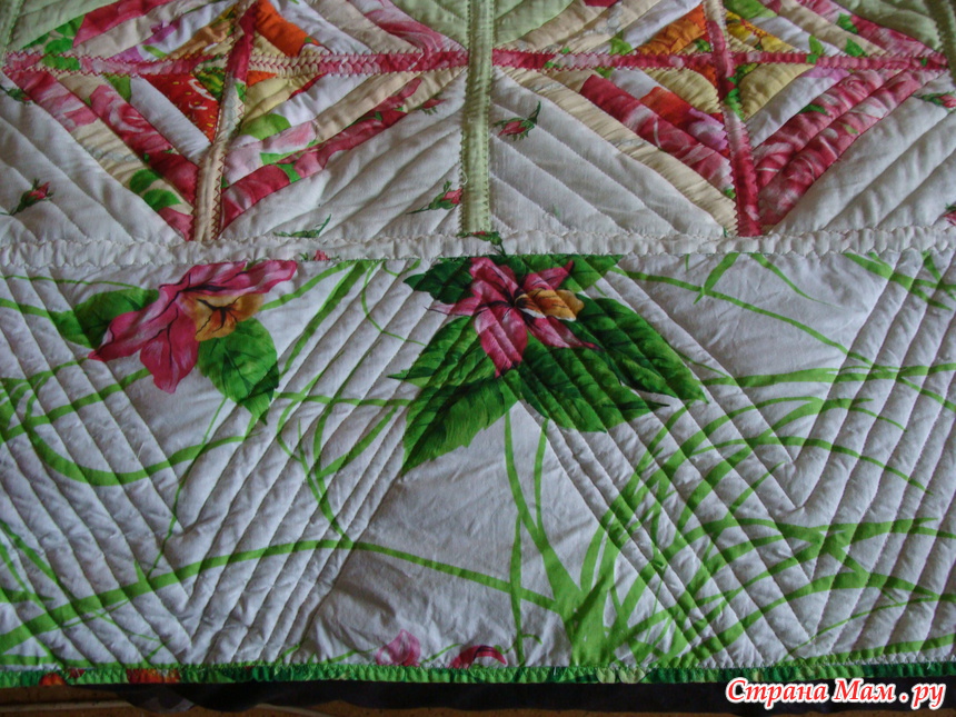 Для начинающих это очень хороший способ, тк стегать все изделие не надо. Каждый блок в процессе шитья уже получается простеганным и соединять тоже очень удобно. Еще один плюс такой техники, это утилизация всех отходов. Бордюры тоже стегала отдельно, шагающей лапкой и потом просто соединила с основной частью.