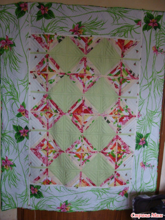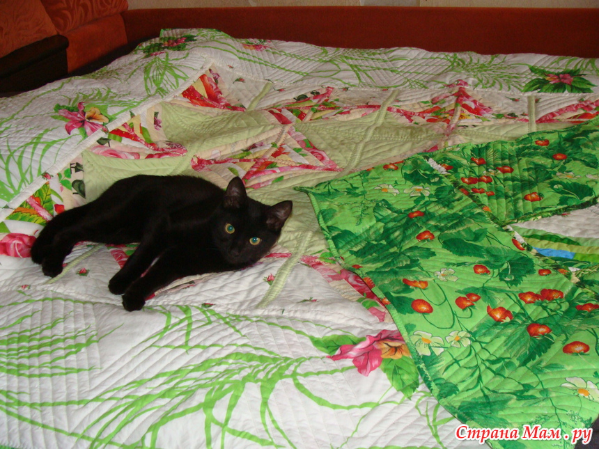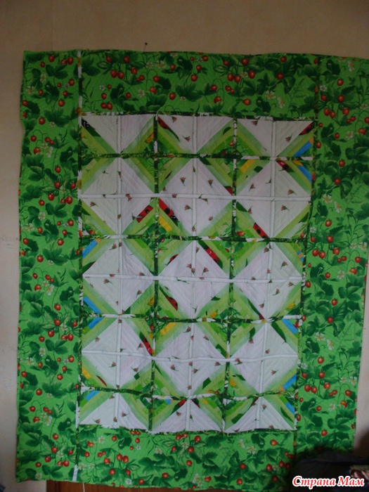 Я наконец то закончила свое первое большое покрывало. Я долго к этому шла, целых два года. Начала шить еще осенью 2012г., а закончила только сейчас. Размер получился 160 х 200 см. В основе этого изделия центральная часть выполнена из двухсторонних квадратов соединенных между собой тесьмой ширина 1,7 см. Ткани использовала только отечественные бязь.