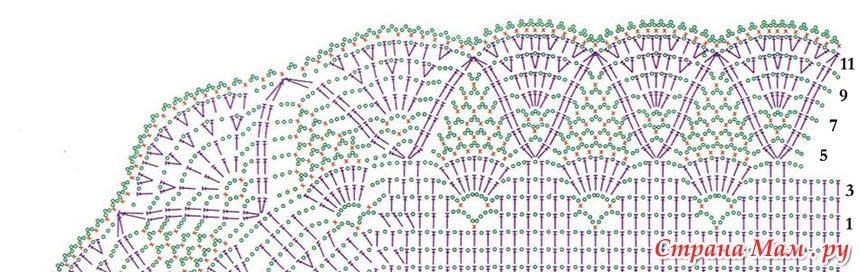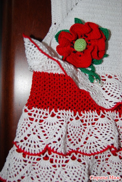 Потом вязала нижний ряд красным цветом галочками. И через каждые 9 рядов привязывала рюши.
