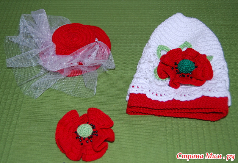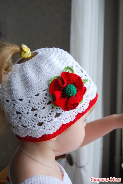 Шапочка вяжется очень просто: цепочка соединяется в кольцо и вяжется по кругу столбиками с накидами, а потом вяжем по схеме 3 ряда веерочков. С изнанки провязываем один ряд белыми нитками, а потом красными сбн.