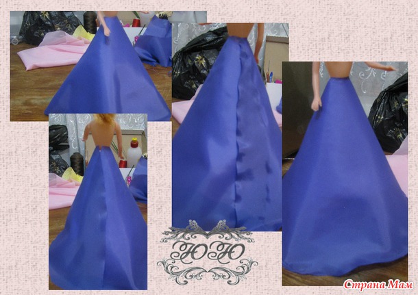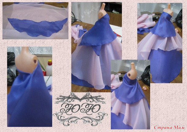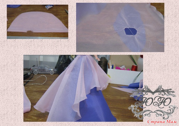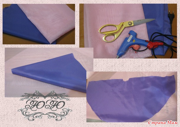 Теперь переходим к самому интересному, это оформление самой куклы и конечно же, цветы из конфет. Здесь раздолье для вашей фантазии, я использую разные кусочки ткани и даже подкладочную. В донном случаи у меня подкладочная ткань и шифон, из подкладочной ткани вырезаем полу солнце и клеевым пистолетом приклеиваем.
