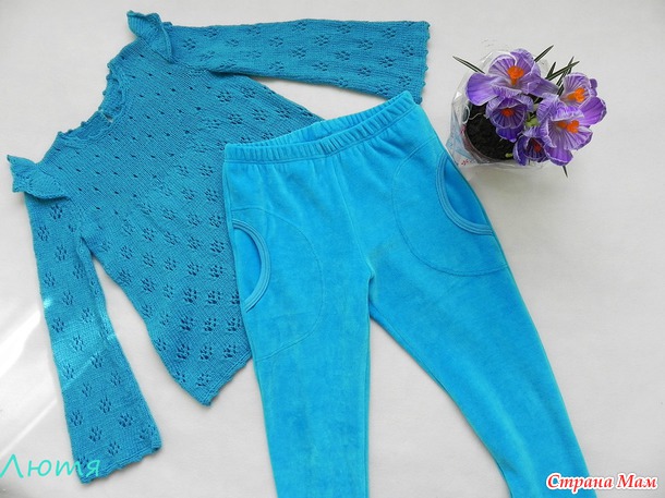 Кофточка связана по описанию с Парижанки. Пряжа итальянская бобинная Beta (NewMill) (состав: 40% шерсть, 10%кашемир, 7%ангорская шерсть, 28%вискоза, 15%полиамид) в 3 нити, спицы № 3. Брючки сшиты из трикотажного бархата никки.