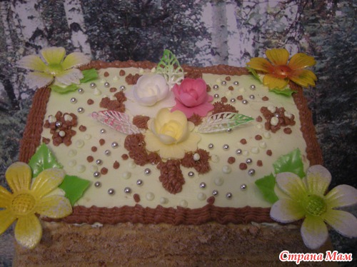Сделать крем из 500 гр. масла и пол-банки сгущенки. Смазать коржи и украсить.