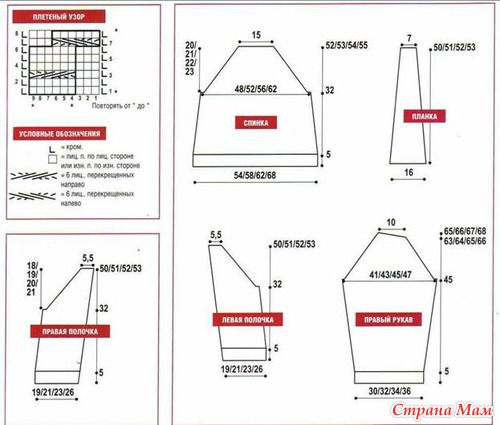 Плотность вязания. Лиц. гладь, спицы № 5: 17 п. и 25 р. = 10 х 10 см: фантазийный узор, спицы № 5: 17 п. и 40 р. = 10 х 10 см; плетеным узор, спицы № 5,5: 24 п. и 28 р. = 10 х 10 см.