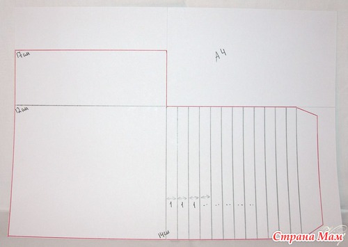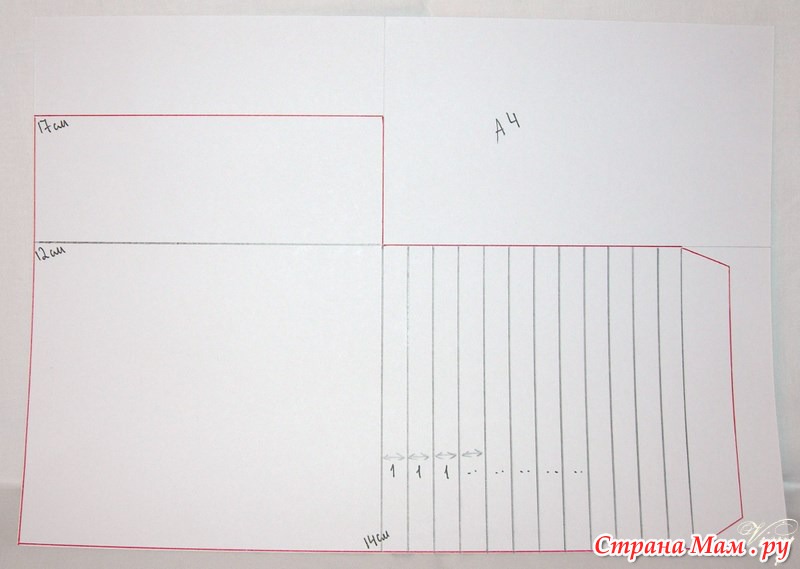 Начертите на листе А4 шаблоны. Я не использовала карандаш, я сразу резала и делала биговку (проведение желобков для сгибов) на линиях сгиба. Если чертите карандашом, лучше потом линии стереть. Красные линии - линии разреза. Чёрные - линии сгиба.