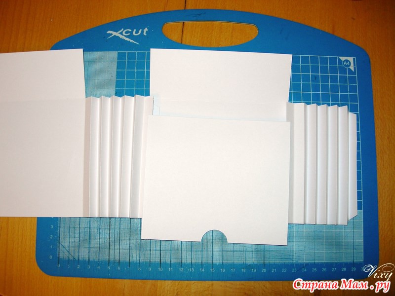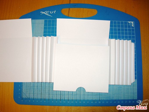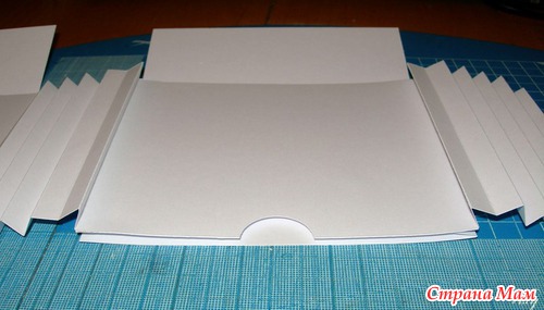 Затем на края разделителя приклейте двуxтронюю клейкую ленту и приклейте на первый сгиб гармошки. Обратите внимание, что полукруглый вырез - это верх.