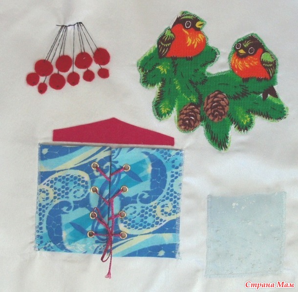 от 4 и старше можно элементы с мелкими пуговками (например по 3-5 рядом на одном элементе) мелкие кнопки, липки так чтобы интересно соединялись детали, я как-то самолет из фетра такой шила в одной книжке, шнуровки различные, разъемная молния, крючки и пр.