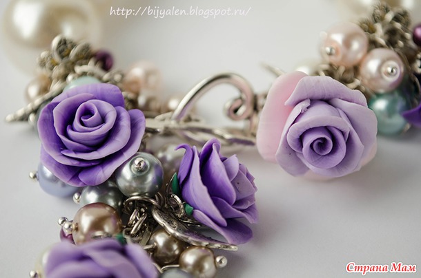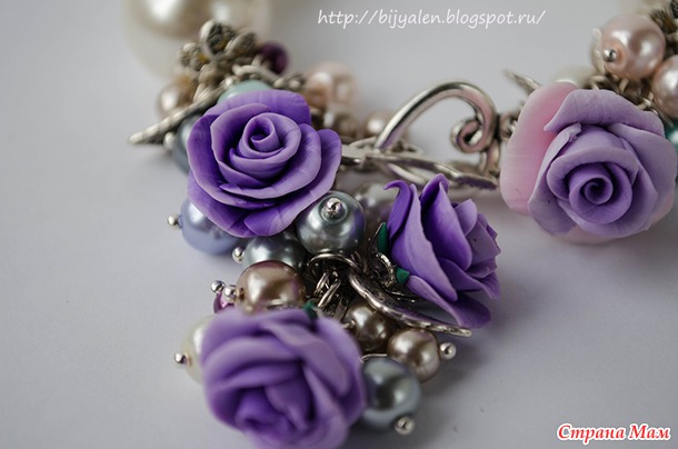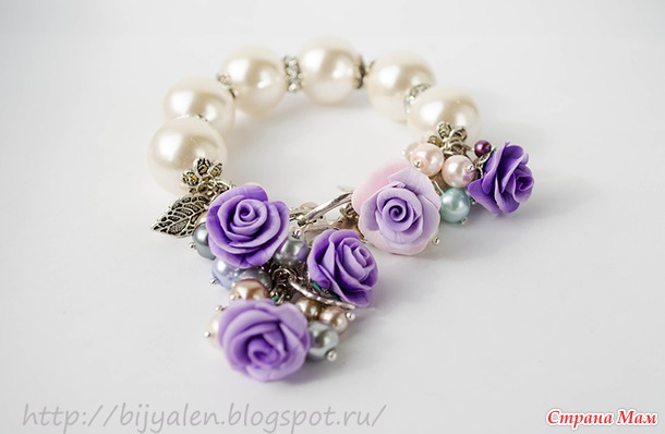 Очень яркий, совсем не повседневный браслет, с яркими не однотонными розочками ручной работы. Очень изыскано смотрится кисть на руке. Крупные бусины под жемчуг перемешаны с ронделями со стразами. Застежка-тогл - сердечко Амура со стрелой. Фурнитура античное серебро. На кисть максимум 17 см.
