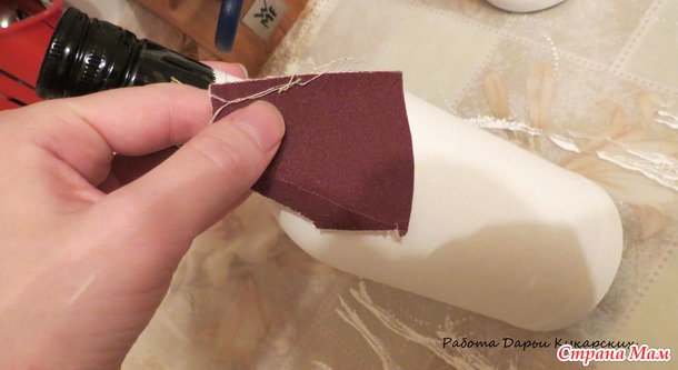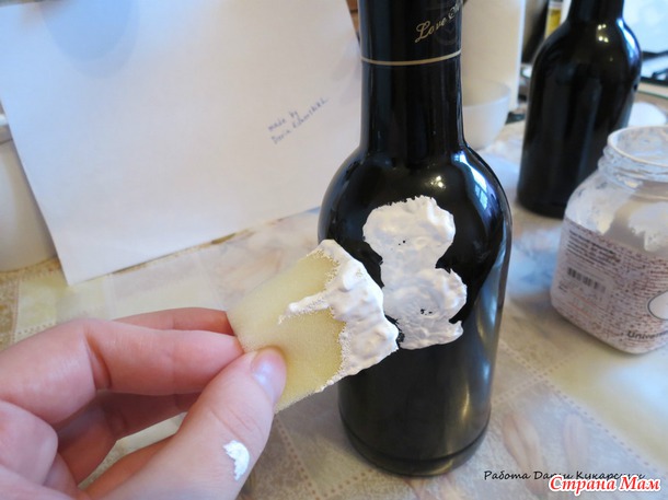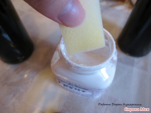 Спонжик опускаем в баночку с грунтовкой и чпокающими движениями наносим состав на бутылку: