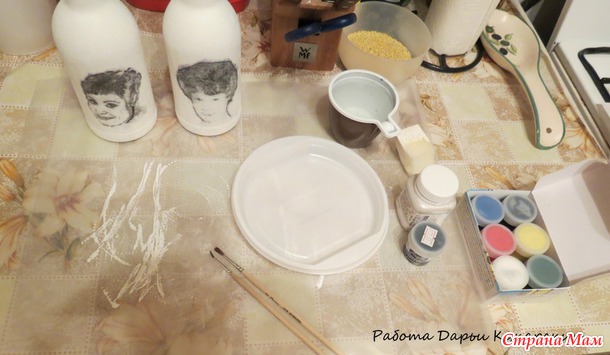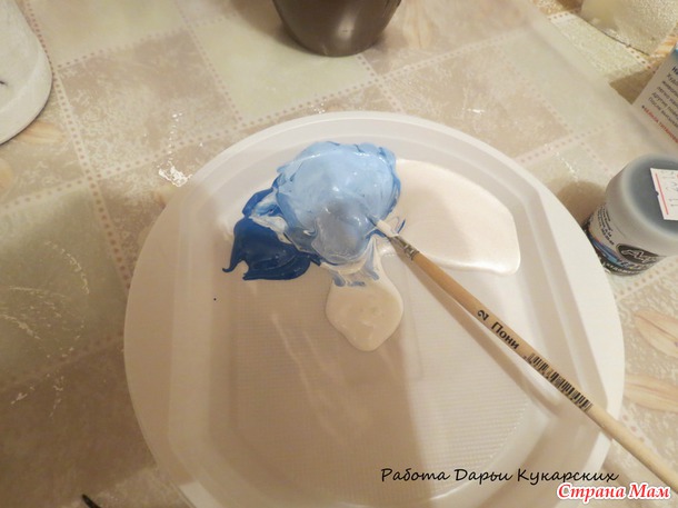 В качестве палитры у меня пластиковая тарелочка, акриловые краски не смываются когда высохнут, поэтому все что надо отмыть лучше отмывать сразу, здесь я развела цвет для фона бутылки