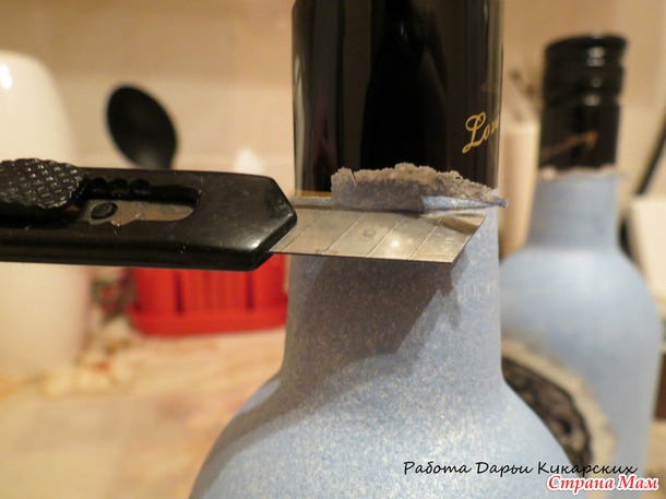 Высохшие бутылочки надо отшкурить, для этого берем наждачку и круговыми движениями, нежно но увренно обрабатываем бутылочки: