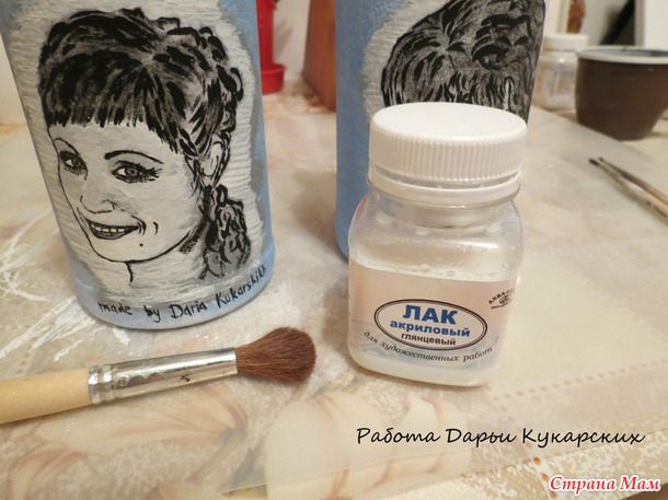 потом клеем мазала чуть банку и приклеевала салфетку сверху ровняла салфетку и снова клеем промазывала,а в конце лаком прошлась.