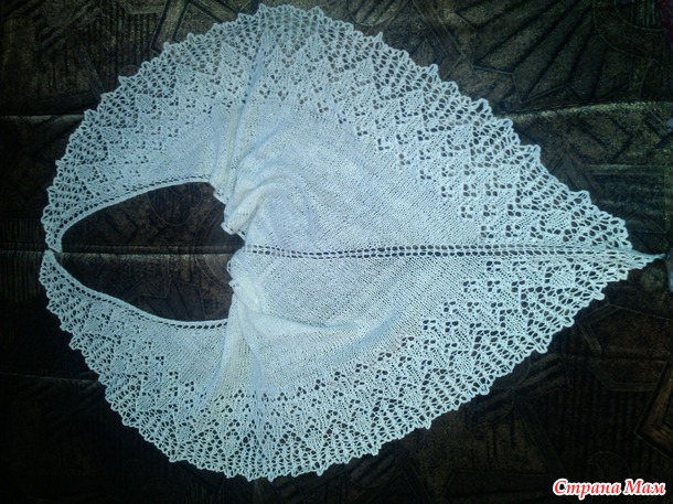 Как раз нашла в хвастушечках шаль Lazy Lara - очень понравилась, но со схемой я не справилась - где то умудрилась запутаться и довязывала уже на глазок. Результат после блокировки понравился - такой нежный белоснежный платок-косынка.