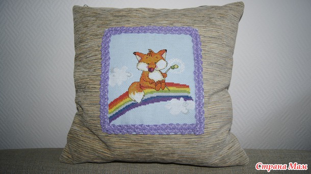Оформила просто - по краю вышивки пристрочила тесьму и пришила к готовой подушке. Радости ребенка нет предела - теперь у него есть своя "именная" подушка (дома мы частенько зовем его Лисенком