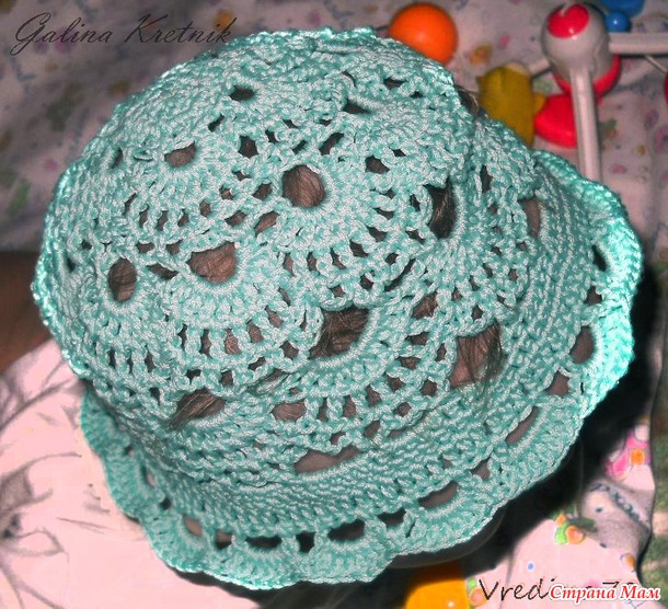 Схемка к полям чепчика (и к зелёной панамке тоже) может подойти такая. А донышко связано от балд... авторская работа.