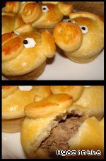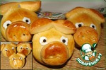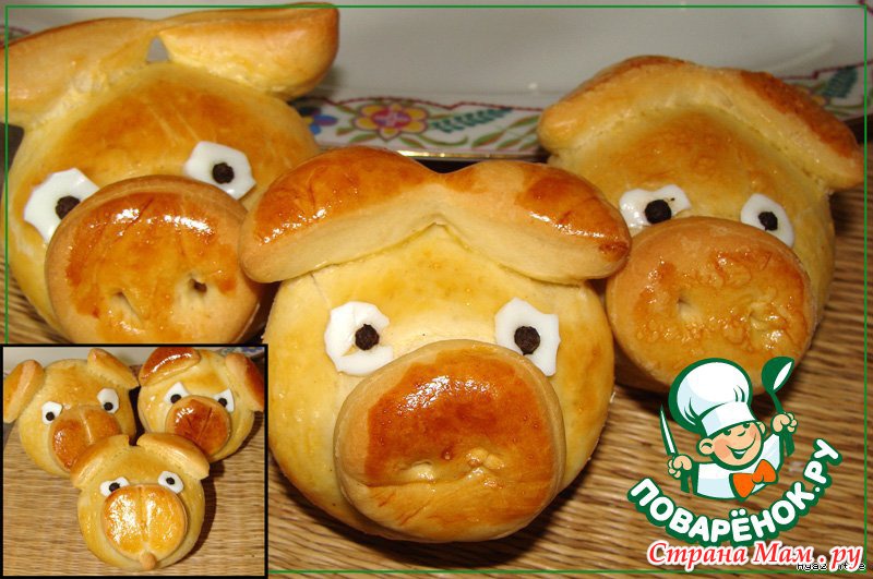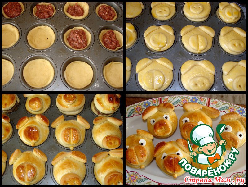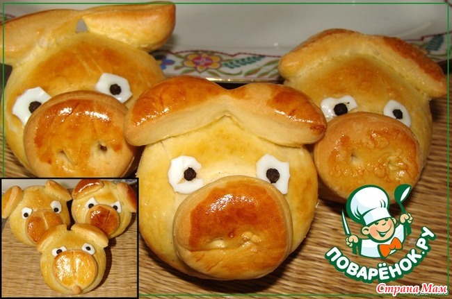 Поверх укладываем "мордочки", смазываем желтком с небольшим количеством воды или молока, прикладываем "пятачки", носики и уши. Еще раз смазываем желтком.
