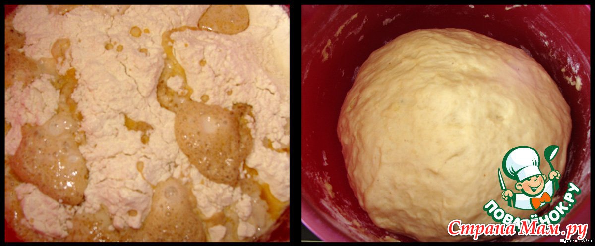 Смешиваем муку, сахар, соль и делаем ямку в середине. Вливаем туда дрожжи, разведенные в теплом молоке. Слегка присыпаем мукой с краев, накрываем полотенцем и ставим в теплое место на 15 минут.