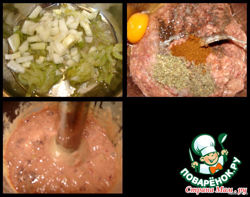 добавляем нарезанную кусочками печень и измельчаем все в блендере или пропускаем через мелкую решетку мясорубки. Добавляем фарш, яйцо и все специи, хорошо перемешиваем.