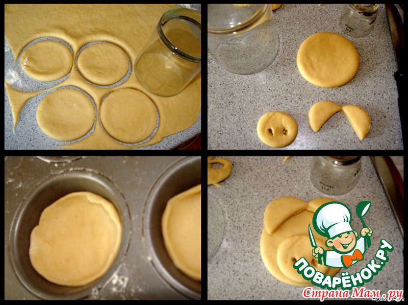 Вкладываем большие кружки в формочки (дно формочек припорошила мукой), формируя чашечки, в которые кладем по 1 ст. л. начинки.