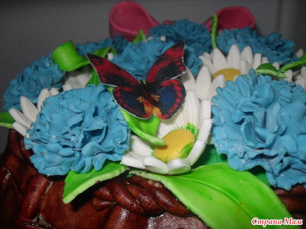 Вот такая цветочная корзинка, внутри - шоколад на кипятке+сметанный крем+вишня, вес 4кг.