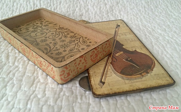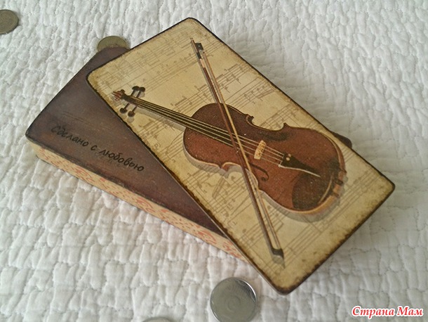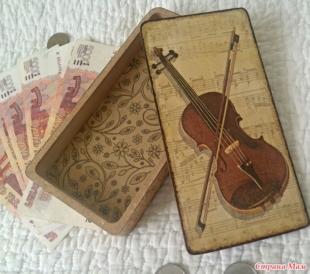 Вот такая купюрница получилась. Скрипка и внутренний узор из салфетки, по бокам трафарет, дно подтемнила морилкой, по уголкам-краешкам прошлась битумом.