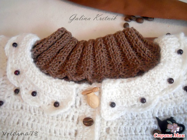 Ну а для комплекта связала ещё из моточка ЯрнАрт джинс кофейного цвета ( 55% хлопок, 45% полиакрил, цвет №40) беретик и манишку-воротничок на пуговке. Получился комплект!