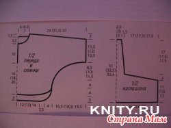 Капюшон: набрать 36 (37) 37 п. и вязать между кромочными изн. гладью. Через 11 (12) 13 см от наборного края закрыть для скосов с обеих сторон 1 х 4 п. и в каждом 2-м р. 2 х 5 п. Затем закрыть с обеих сторон в каждом 12-м р. 1 х 1 п. Через 31 (32,5) 33,5 п. от наборного края закрыть оставшиеся петли