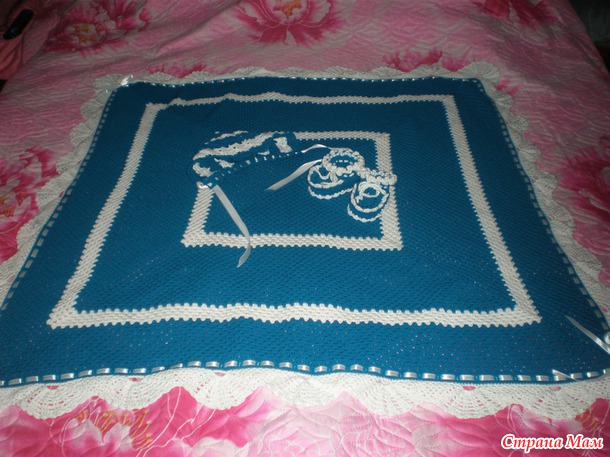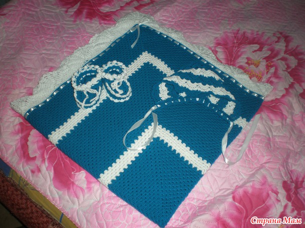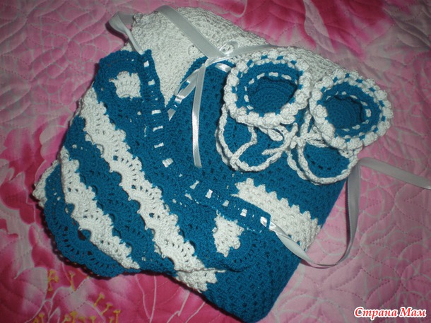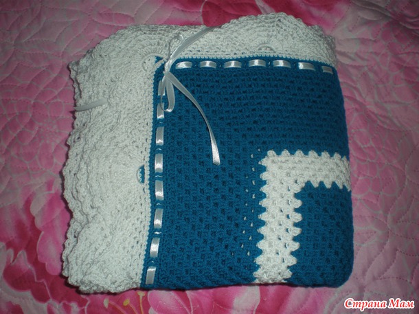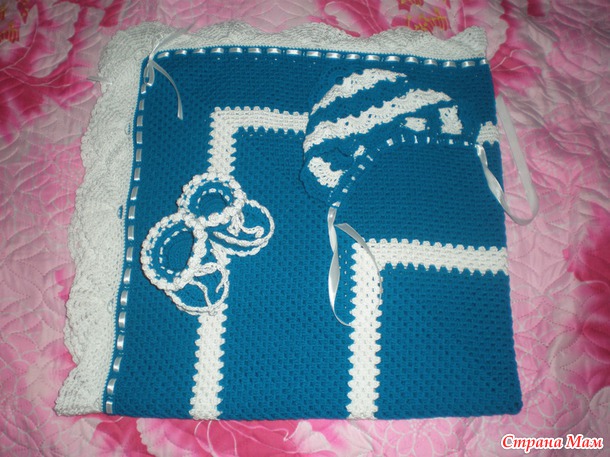 Наконец-то я вставила ленточку в плед, теперь можно и показывать всё вместе. Пинетки и чепчик уже демонстрировала вот тут https://www.stranamam.ru/post/7466732/,https://www.stranamam.ru/post/7438249/
