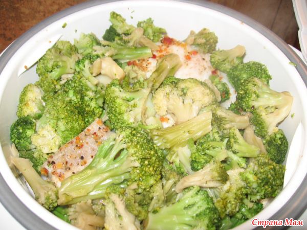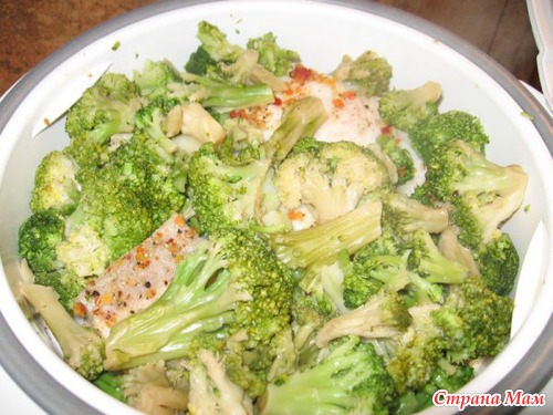 Рыбку кладем в пароварочную корзинку, солим, посыпаем специями рыбными, сбрызгиваем лимонным соком. Сверху выкладываем замороженную смесь из цветной капусты и брокколи. И на режим "варка на пару" минут на 10-15.