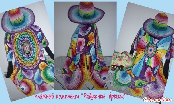 Связался вот такой пляжный комплект на лето... Ниточки Ирис, "подобрала" все ниточки из своих хомячьих запасов. а то их столько собралось, что еще на одну тунику хватит. Выполнено в технике ирландского кружева. а началось все с простого, связала радужные салфетки (причина та же - собирала все остатки ниток), потом от них придумалась туника