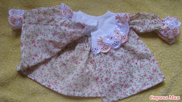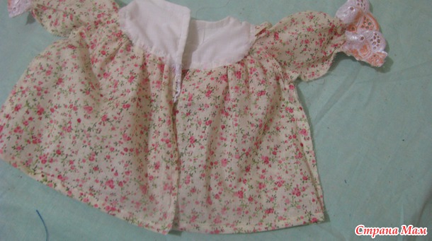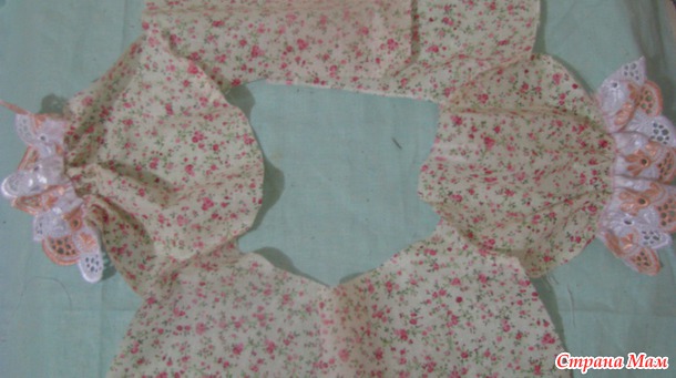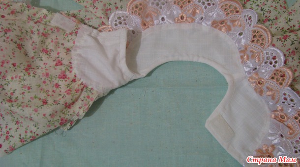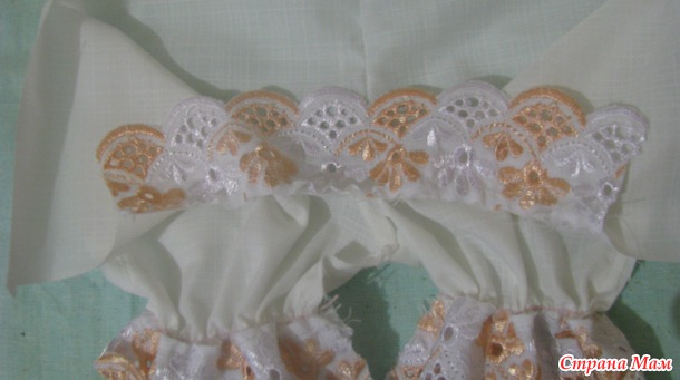 На деталях кокетки стачать плечевые швы контрольная метка№4, Кружево пришить к нижнему краю кокетки, и к нижнему краю рукава. Пришить эластичную тесьму по низу рукава.