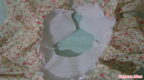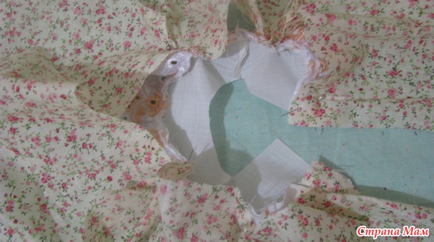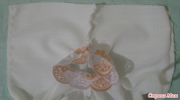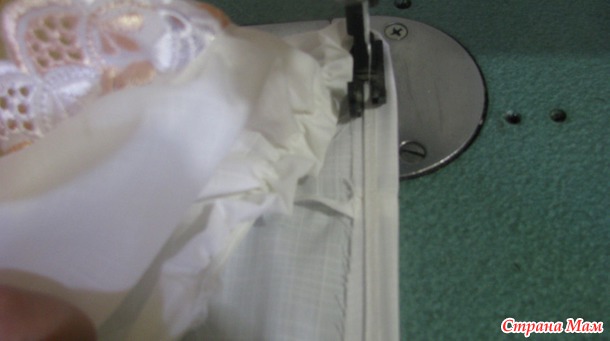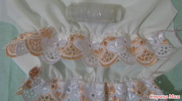Тесьму приточать к верхнему краю кармана, нижнею часть при собрать.