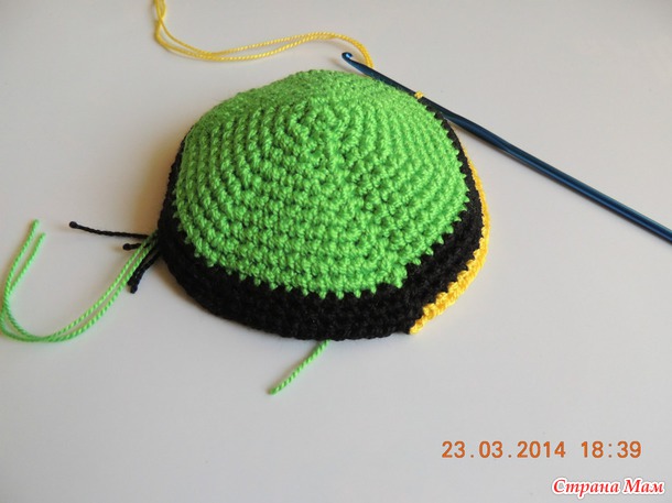 Я решила сделать глаза разного размера. Больший глаз вяжется по тому же алгоритму, но не до конца, а то будет на голове казаться слишком выпуклым.