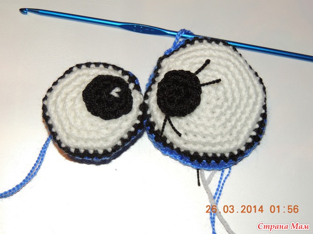 Далее вяжем 2 зрачка, просто набираем 6 сбн в кольцо, стягиваем и замыкаем. Зрачки нашиваем и начинаем вязать заднюю часть глаза синей нитью.