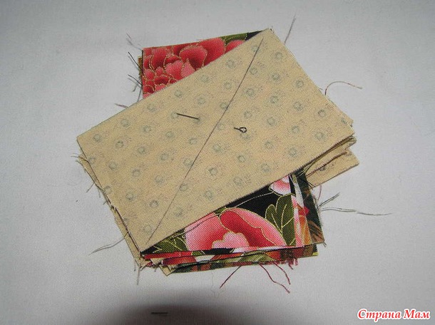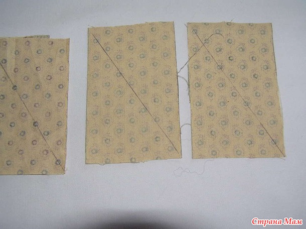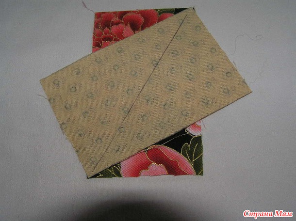Затем берем прямоугольники из ткани для фона, и чертим диагональ от верхнего левого угла до правого нижнего, вот так.