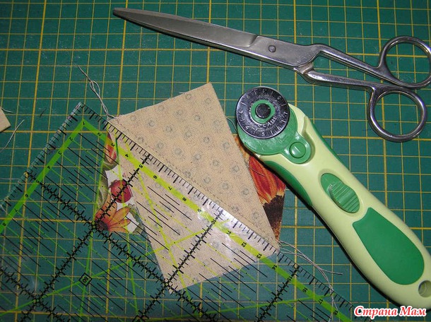 Затем разрезаем сшитые таким образом прямоугольники строго по линии. Разрезать можно и ножницами, но мне показалось и быстрее и удобнее резать с помощью роликового ножа.
