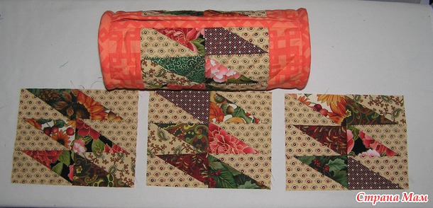 Из таких блоков можно сшить косметичку, сумку, мешочек для хлеба, грелку на чайник, подушку. А можно эти блоки использовать для бордюра покрывала, или сшить дорожку на стол.