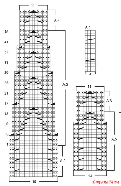 Плотность вязания: 24п. х 28 рядов узором по диаграммам А1+ А4 = 10 х 10 см