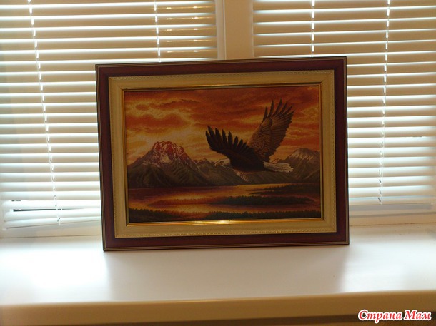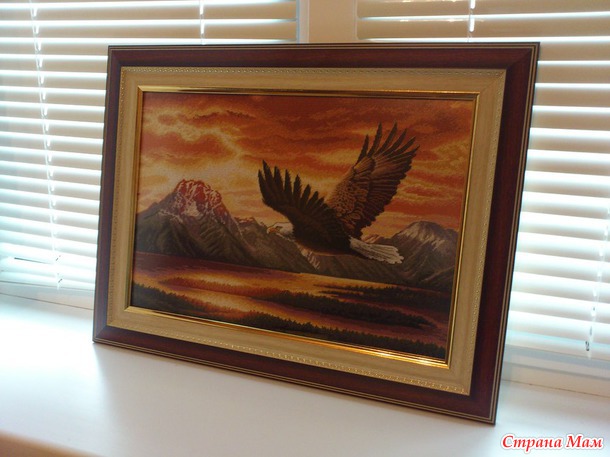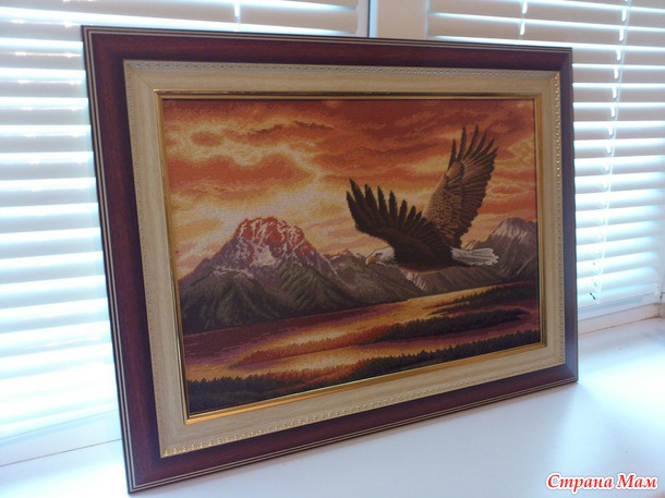 Давно влюбилась в этого орла, но все цена пугала. Потом как-то решилась и заказала. Сначала вышивала запоем, потом чуть поднадоело и стала отвлекаться на другие работы, ведь до этого за такие большие вышивки не бралась. На все ушло около 7 месяцев.