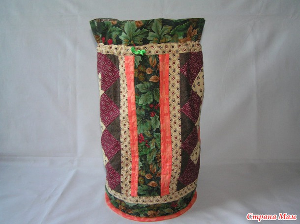 Ну в общем, вот и вся премудрость. Потом просто пришиваете донышко к получившемуся цилиндру, который у вас уже сшит и состоит из лоскутного верха и подклада, просто пристрачиваете дно-круг к цилиндру, потом закрываете края окантовкой из косой бейкой и все, мешочек готов.