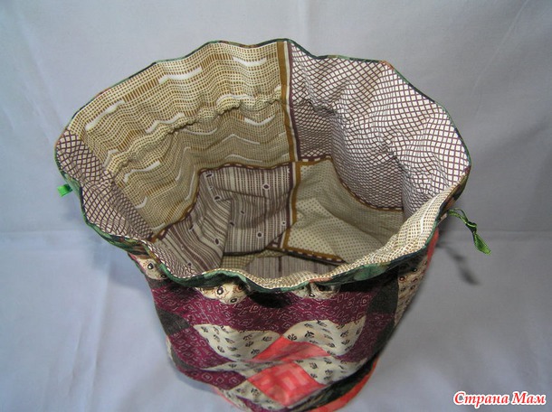 Потом к сшитому "цилиндру" лоскутного прямоугольника, к верху его, пришиваете такую же деталь подклада, тоже сшитую трубой, складывая детали лицом к лицу. Сшили, вывернули, потом пришили кулиску для веревочек. Я кулиску не пришиваю, как таковую, а просто делаю две строчки на расстоянии 2 см друг от друга. В лоскутном верхе надо это предусмотреть, и вот та светлая полоска по верху - это и есть кулиска, куда будет продергиваться ленточка-веревка для завязок. Я эту полоску сшиваю из двух деталей, и края у них подшиваю, чтобы веревочки в этом мешочке можно было продернуть с двух сторон. То есть, одну веревочку продергиваете в одну сторону, вторую - в другую, потом, стянув эти веревочки в разные стороны у вас мешочек закроется.