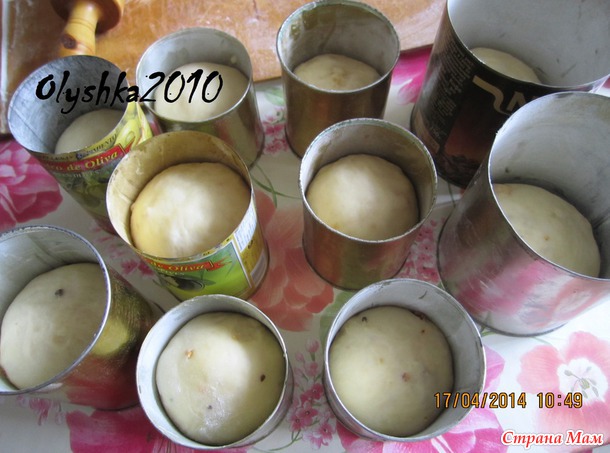Мои комментарии: Я замешивала в ХП на режиме тесто с изюмом (2ч. 20 мин). Поэтому изюм в исходную смесь не клала, а добавляла в процессе замеса автоматически. Готовое тесто разложила по формам (я пекла в банках от кофе Нескафе и в бумажных формочках). Получилось 4 куличика (на фото).