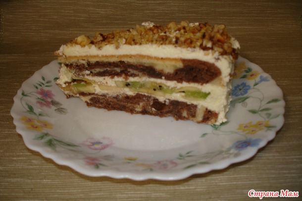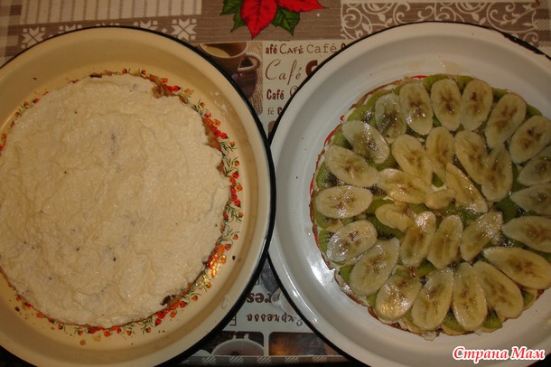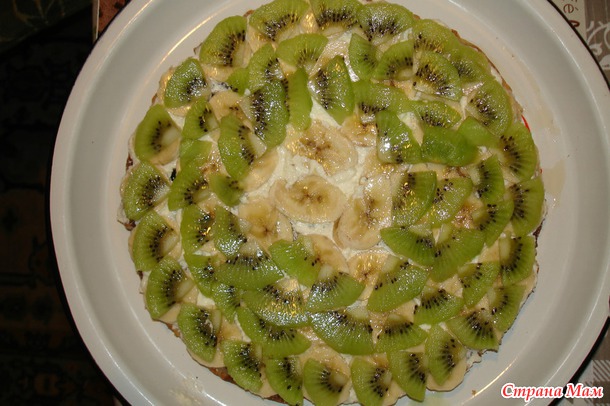 Банан, киви, и опять слой бананов. Второй корж просто намазать кремом