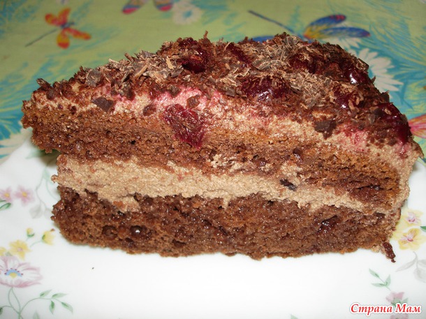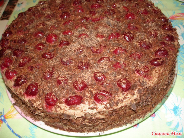 Бабаевский) и верх и бока, просто покидала, а сверху укладываем вишни, сок тоже не отжимаю, он потом немного растекается, такими пикантными кислыми прожилочками, очень "шармно" получается.