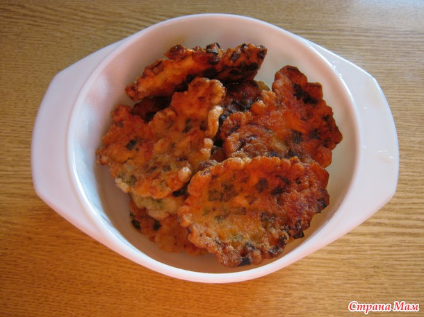 Куриную грудку (у меня была половинка) режем на маленькие кусочки, где-то по кубическому см. Складываем в миску, добавляем соль, перец, 3 ложки крахмала и 3 ложки майонеза, любые приправы, зеленый лук, Перемешиваем и ставим в холодильник. Можно на 3 часа, можно на ночь. Пекутся, как оладьи. по желанию можно потом протушить.