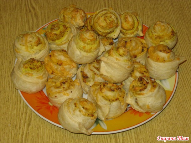 )Купила слоеное тесто, не дрожжевое. Натерла сыр. Тут 2 варианта. Раскатала тесто, смазала французской горчицей (с семенами) и посыпала сыром, а можно просто ярко-выраженными приправами посыпать и сыр сверху. Скатала рулеты высотой 2 см и выложила на противень с пергаментом. Ничем не смазывала. Пекла 10-15 минут.