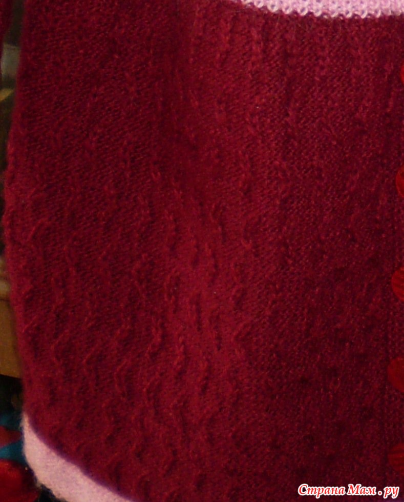 Полка. Набирают на спицы 84 петли, вяжут2 см двухизнаночной гладью, затем узором и со стороны застежки вяжут на 8 петлях планку с петлями для пуговиц. Связаввсего 23 см, сбавляют 32 петли по всему ряду до планки и вяжут 3 см ластиком 1+1 и 4 см узором. Продолжая вязать узором, для проймы сбавляют по 6 петель сразу и 3 раза по петле через 1 ряд. Вяжут еще 8,5 см и сбавляют для выреза ворота сразу 10 петель и затем 12 раз по 1 петле через 1 ряд. Для плеча делают сбавки так же, как и на спинке. Вторую полку платья вяжут так же, как первую, но не вывязывают на планке петли для пуговиц.
