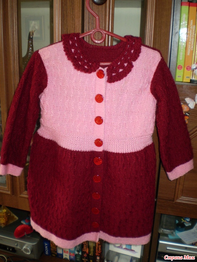 Захотелось связать своей дочке платье, но никак не могла найти в интэрнэте описание. Затем порылась дома в старых книжках и нашла книгу "Ручное вязание детских изделий". Это был мой первый опыт по вязанию платья, до этого были штанишки и комбинезоны.