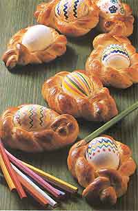 Духовку разогреем до 190 градусов. Из двух жгутиков выплетаем косичку, формуем ее в круг и укладываем на противень. Смазываем яйцом, посыпаем или орешками, или тмином, или кунжутом. Ставим в духовку, запекаем около 30 минут при 180 градусах. Когда косыночки остынут, в каждое гнездышко положить пасхальное яичко.